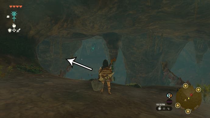Keep going left until you see a stack of rocks that stand out from the rest of the wall. Now, all you have to do is to explore these rocks. One option is to combine an arrow with a bomb flower and shoot the rocks. There are a few of these flowers close to the wall where the rocks are if you find yourself with empty pockets.