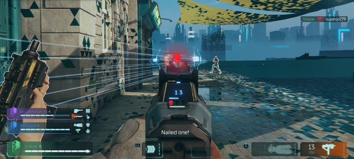 Spotting the telltale golden glow I throw myself onto jump pad and launch up onto the rooftops. Bullets are flying past - miraculously, not a single one hits me - and I tear after my teammates, roof tiles tinkling beneath my feet. Suddenly, my pal turns and trains his Hexfire over at the rooftop across from me, and I realise we're not alone. But before I get the chance to follow suit - before I even raise my gun - I've been one-shotted by an invisible sniper, and I'm dead. Again.